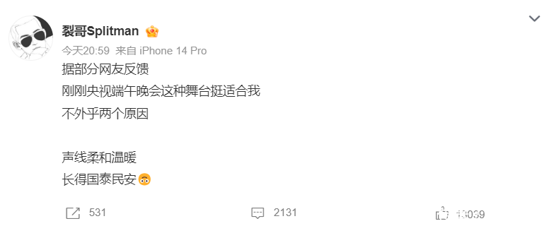 不得不说,苏醒和央视端午晚会的气派越过适配,他的舞台发扬也得回了好评。他本东说念主也很清翠,在外交媒体共享网友的好评:刚刚央视端午晚会这种舞台挺符合我,不过乎两个原因,声线情切推辞,长得国富民强。